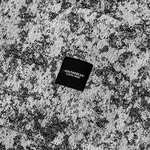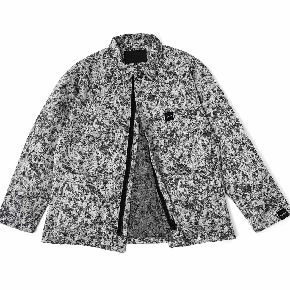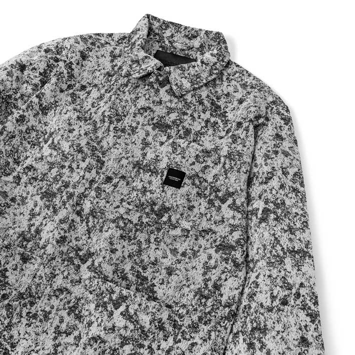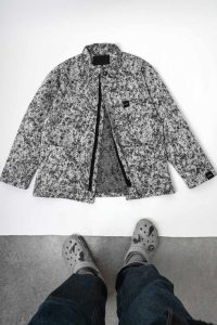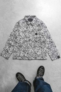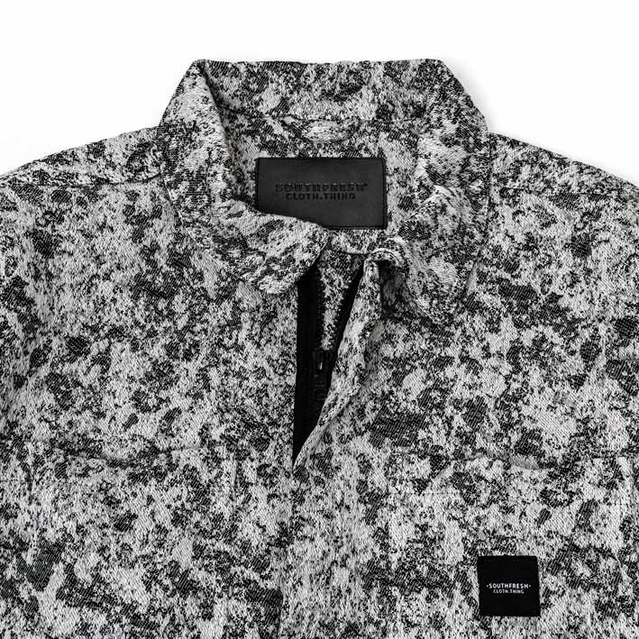 Overshirt jacket in jacquard 100% cotone prodotto da antiche tessiture artigianali in Salento con la caratteristica fantasia LICHENI camouflage di Southfresh . ( Variante GFNRS CAMO2.1 – Grey Flecktarn Non Reversible Salento Camouflage)