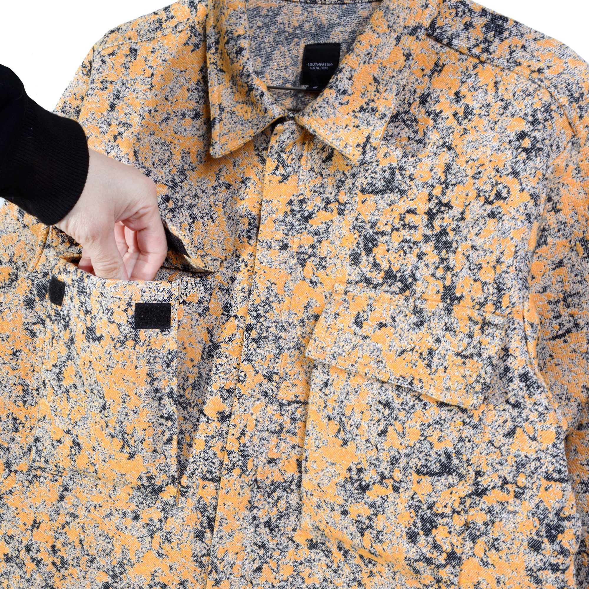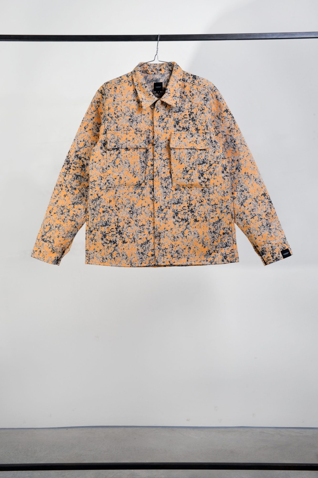 Overshirt in cotone jacquard prodotto da antiche tessiture artigianali in Salento con la caratteristica fantasia LICHENI camouflage di Southfresh . ( Variante YFSCAMO2.1 )